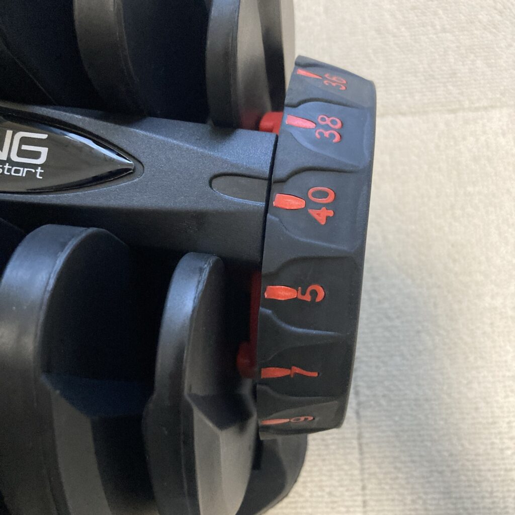 「可変式ダンベル」ってのは、重量を任意に変えられるタイプのダンベルで、いろんな可変タイプがあるのですが、このタイプは「ダイヤル式」。
